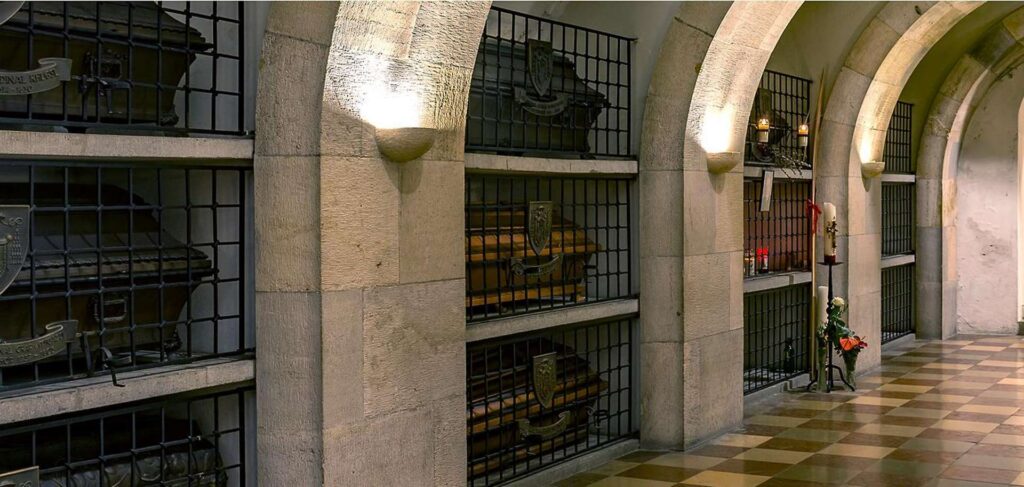 まずは地下にこんな場所があったのかとちょっと驚きます。地下は旧墓地と新墓地に分かれており、旧墓地には16人のシュテファン大聖堂にゆかりのある司教・大司教などの棺がきれいに並べられています。
