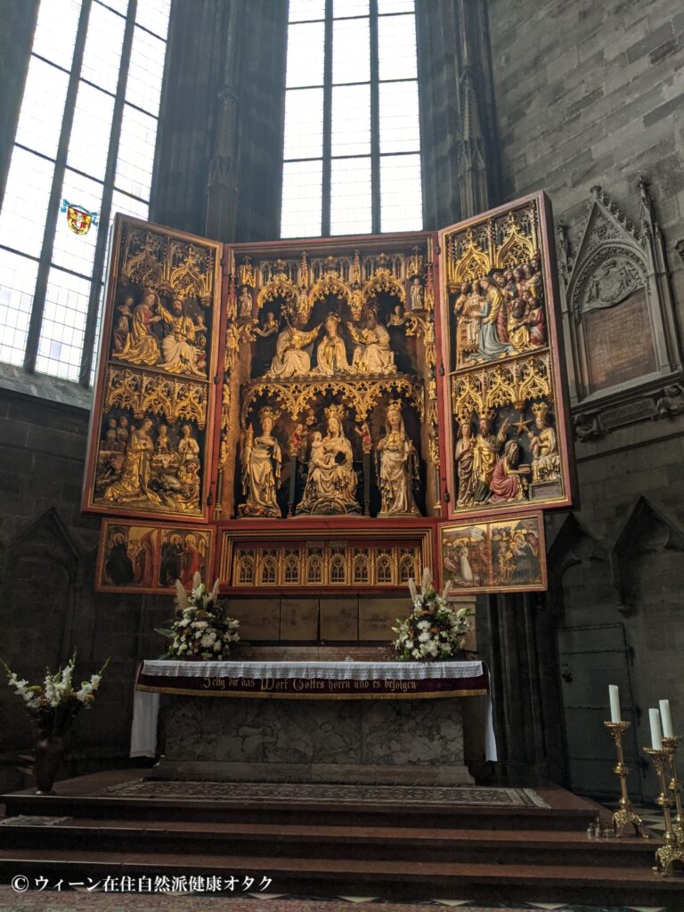 南側のチャペルにあるのはウィーナー・ノイシュタット祭壇です。1447年頃の ゴシック様式の多翼祭壇で、マリアの生涯を細かな場面で描いた美麗な絵が特徴です。