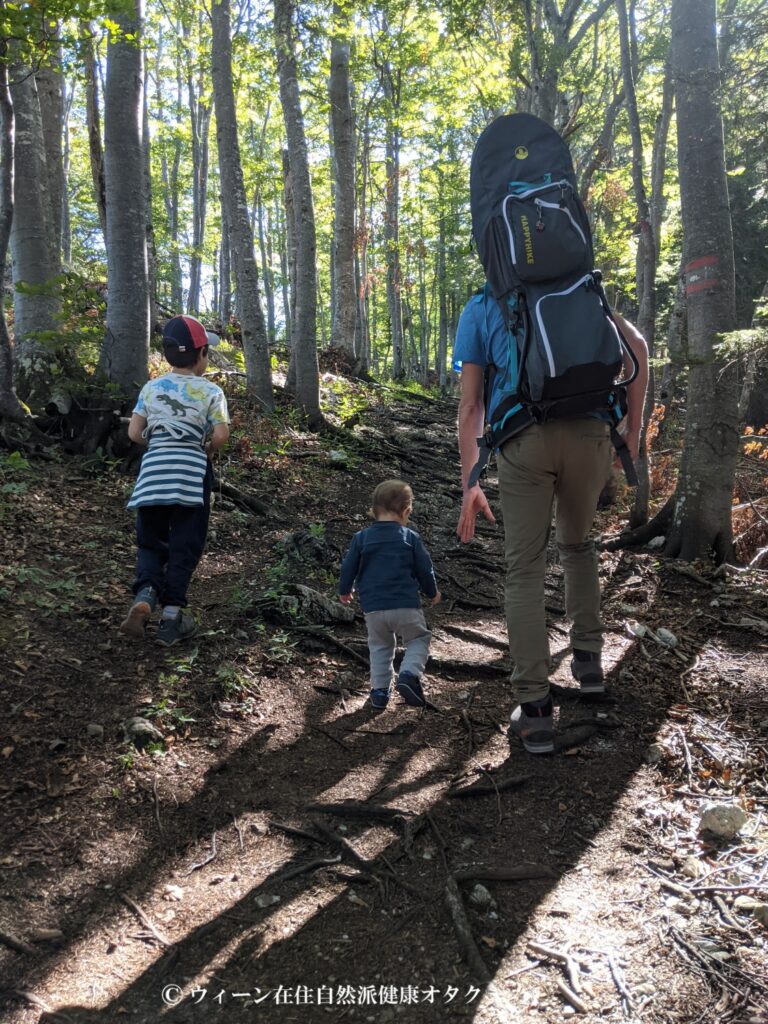 登山日和だったこともあって素晴らしい自然を満喫できました!この辺りはオーストリアでも最も森林が豊かな場所として知られており、国内でも数少ない原生林が広がっている地帯です。大人でもまあまあの手ごたえがあったので7歳の長男は本当に良く頑張ったと思います。何でこんなに歩かなくてはいけないのかと多少文句を言っておりましたが、長男は歩くのが難しい地面ほど燃えるタイプ。このゲラーは手を使って上がらなければいけないところもあったのでそれなりには楽しんでいたようです。そして次男も途中どうしても歩きたいとごねたので、少し歩かせてみたのですが、かなり根っこや石が多くてガタガタの地面でもしっかりとした足取りで歩いておりました。