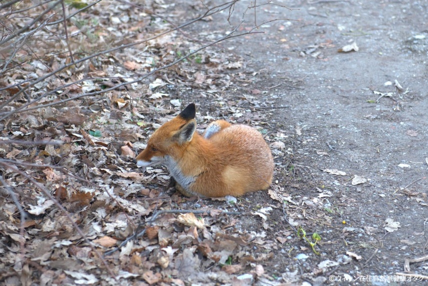 そのおじさんの話によると、数か月前から公園に出没するらしく、どうやら雌の若いキツネだということ。人間に対して全く恐怖がなく、逃げないどころか私が近づいても座っているだけ。