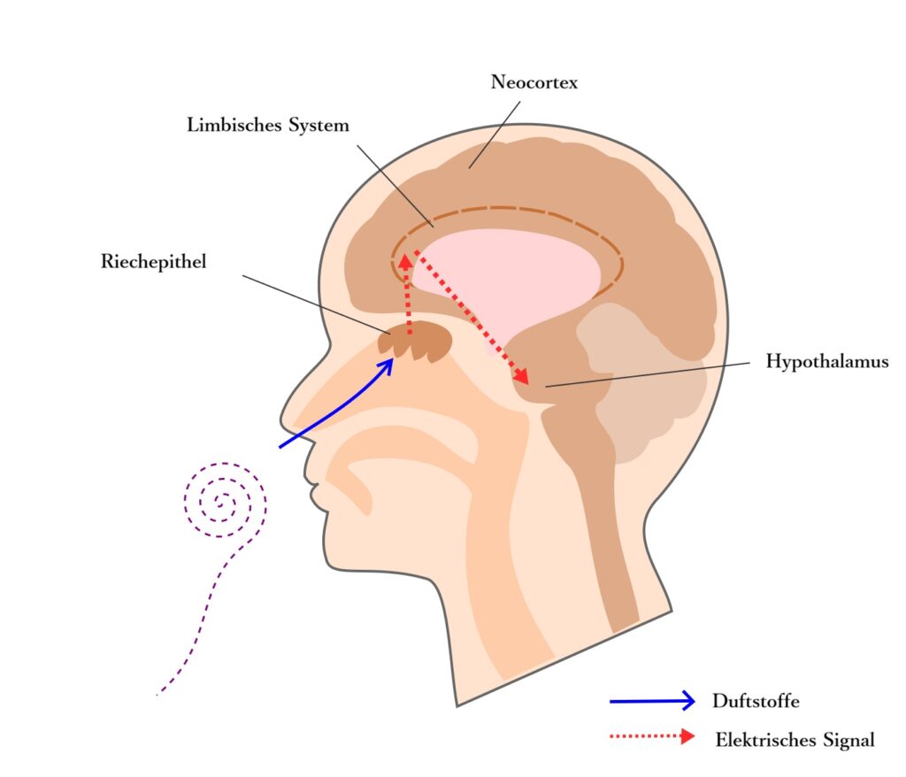Das klingt vielleicht kompliziert, ist aber eigentlich einfach. Düfte wirken direkt auf unser Gehirn. Das limbische System ist einer der ältesten Teile im Gehirn und enthält Strukturen wie den Hippocampus, der für Erinnerungen zuständig ist, die Amygdala, die Emotionen verarbeitet und entscheidet, ob etwas angenehm oder unangenehm ist, und den Gyrus cinguli. Deshalb erinnert man sich beim Riechen an Dinge oder entscheidet sofort, ob man etwas mag oder nicht. Die Duftmoleküle gelangen in die Riechzellen, und von dort dauert es nur etwa 0,2 Sekunden, bis die Signale das Gehirn erreichen. So schnell urteilen wir über vieles! Außerdem arbeitet das limbische System eng mit dem Hypothalamus zusammen, der das autonome Nervensystem und die Hormone steuert. Düfte können also, ob positiv oder negativ, den ganzen Körper beeinflussen.