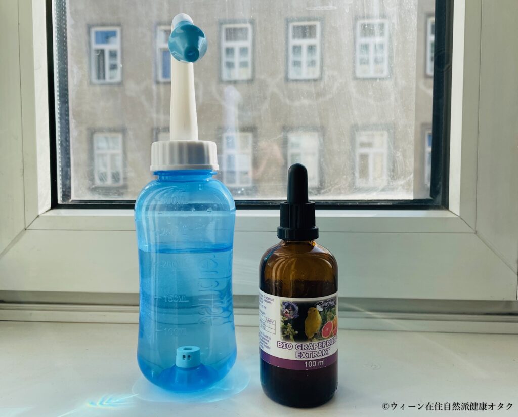 Rezept: 200 ml lauwarmes Wasser + ½ Teelöffel Salz + ein Tropfen Grapefruitkernöl. Dieses Öl enthält Flavonoide und Vitamin C und gilt als natürliches Antibiotikum. Mein Partner hatte früher mal beginnende Nebenhöhlenentzündung und konnte sie mit Nasenspülung erfolgreich behandeln. Daher habe ich es ausprobiert, auch wenn es anfangs ein bisschen unangenehm ist, wenn die Flüssigkeit von einem Nasenloch ins andere fließt.