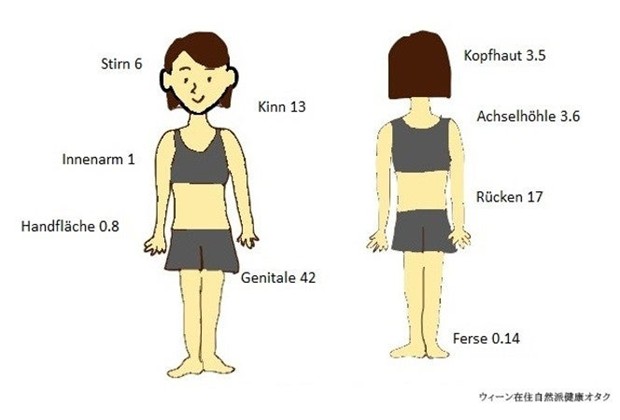 Wenn man zum Beispiel etwas auf die Innenseite des Arms aufträgt, liegt die Hautabsorptionsrate bei 1. An der Stirn ist sie etwa sechsmal so hoch, im Mundraum (nicht in der Grafik) etwa 15-mal so hoch, und an den Geschlechtsorganen sogar rund 40-mal so hoch. Besonders die Schleimhäute im Mund oder im Genitalbereich, wo die Haut dünn ist, weisen eine extrem hohe Absorptionsrate auf.
