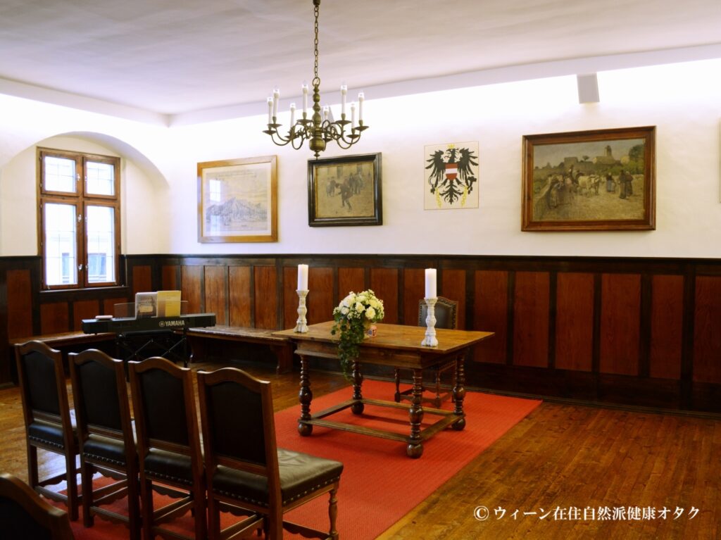 そんな街の中にデュルンシュタインの役所があります。とても役所とは思えない石畳の中庭と石の階段、中庭を見下ろせるバルコニーのような廊下、そして式を挙げるこれまた中世の雰囲気漂う部屋に私は一目ぼれしてしまいました。もうここで決定です。