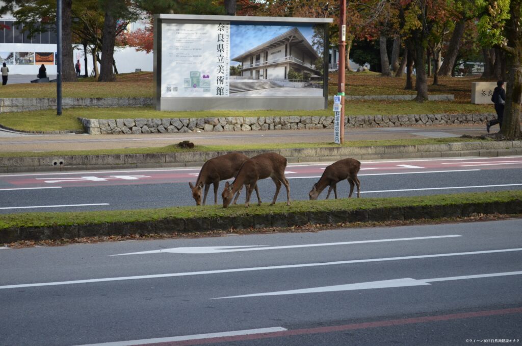 今回滞在したホテルは奈良公園や東大寺方面までそこまで遠くないところにあったため、母と朝から30分ほど歩いて東大寺へと向かいました。するといきなり大量の鹿がどこからともなく出てくるではありませんか!しかも道路にまで。