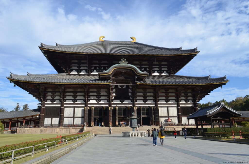 東大寺は、752年に聖武天皇により建立された華厳宗の大本山。その当時、地震や疫病といった災難によって高まった社会不安を収めるためにつくられたといいます。東大寺と言えば誰もが思い浮かべるのが青銅製の大仏(盧舎那仏)ですが、これが納められた大仏殿は世界最大の木造建築。