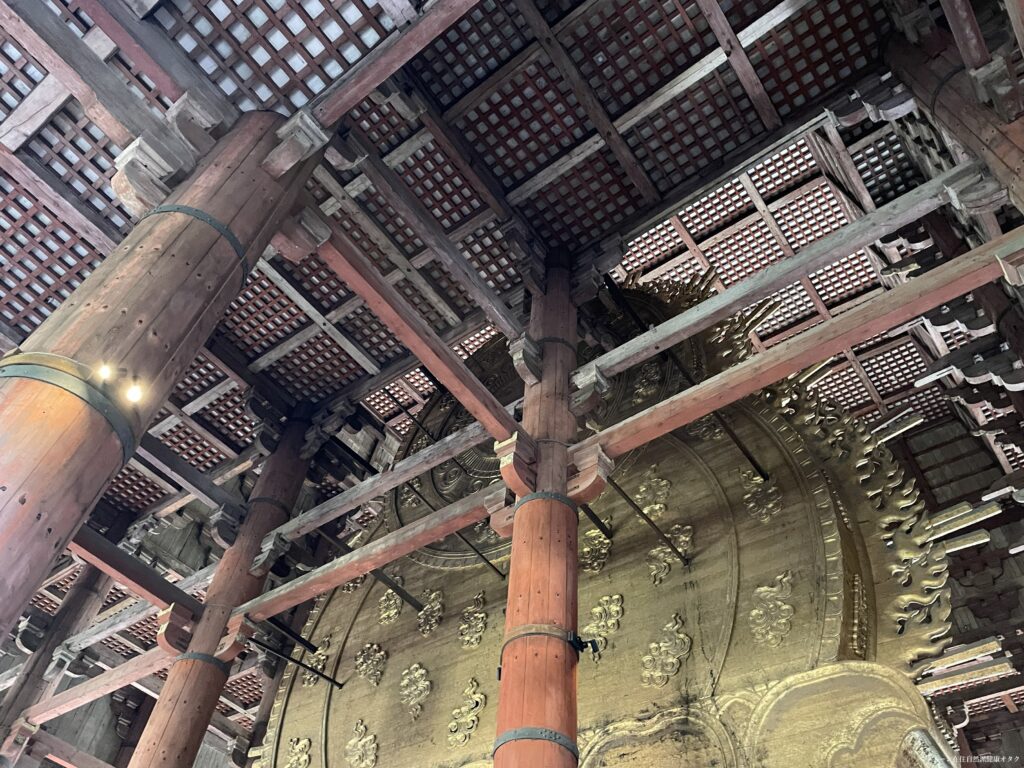建築は、奈良時代に発展した天平様式(唐の影響を受ける)を代表する和様建築と言われるそうで、日本独自の木組みの技術やデザインが使われています。大きな梁と柱で支えられており、釘をほとんど使わず「組み木」という方法で組み立てられています。