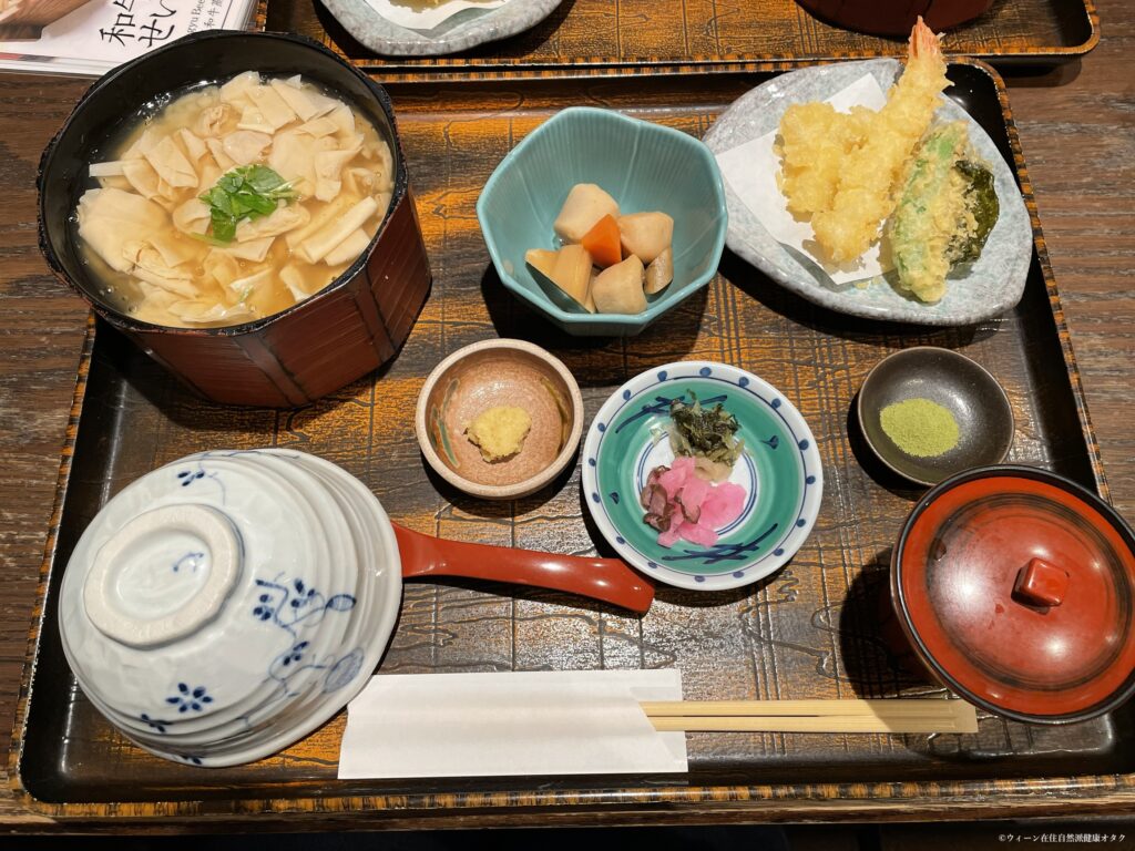 私が注文したのは湯葉の定食。湯葉は精進料理に食材であったこと、また良質な地下水がお豆腐や湯葉を作るのに適していたということもあり、京都名物としても知られていますね。最後にお漬物やおばんざいなどを堪能したのでした。