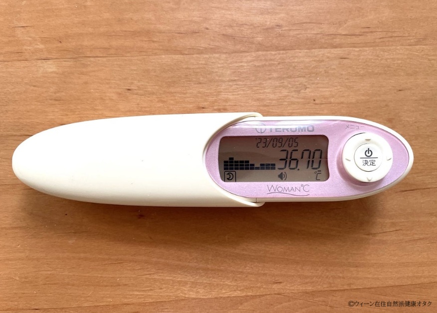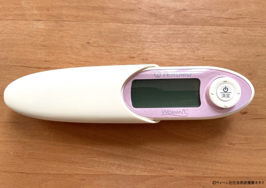 例えばこれが私がずっと使っているTERUMOの婦人体温計(今はもっといいのがあると思います)なのですが、毎朝起きた時に舌の下に体温計を入れて、ピピッとなるのを待ちます。目覚まし時計代わりになるので結構便利。amazonでも買えます。