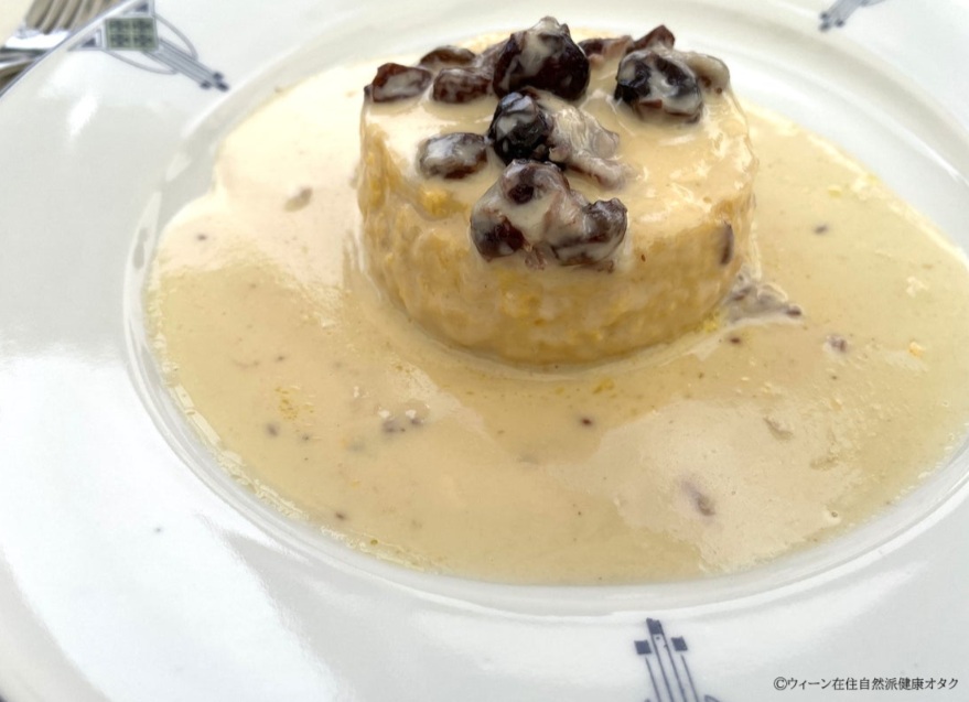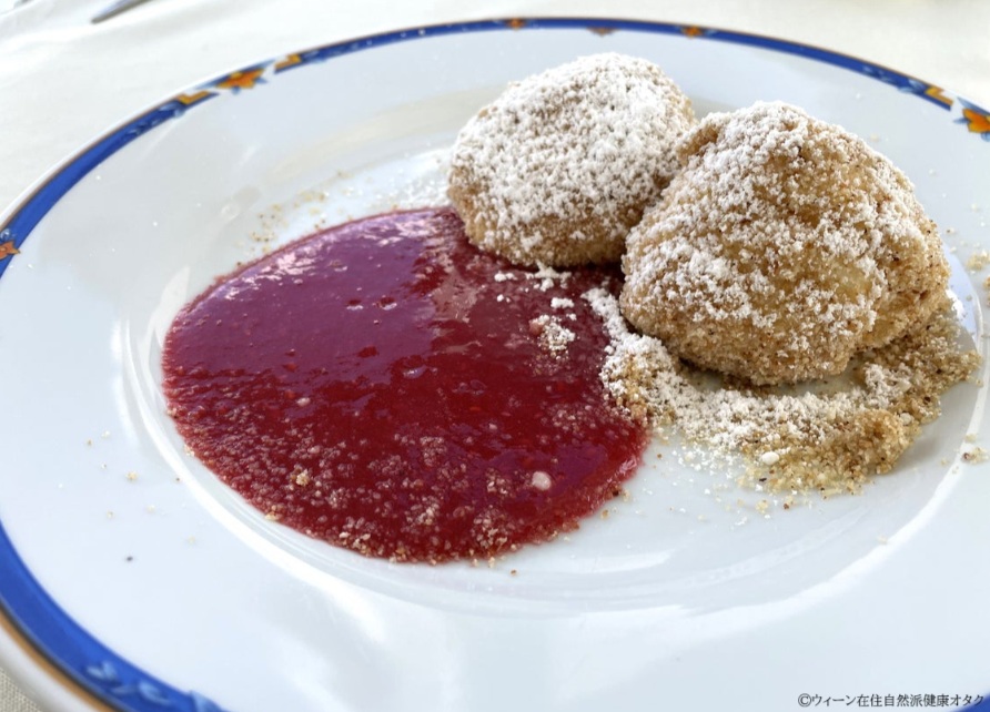そしてこれはオーストリアのデザートでTopfenknödel(トップフェンクネーデル)と言い、フレッシュチーズをお団子にしてパン粉と砂糖をフライパンでまぶしたもの。ラズベリーソース添えです。お腹がいっぱいとは言え甘いものは昔から別腹。こちらも堪能致しました🥰
